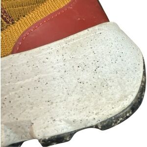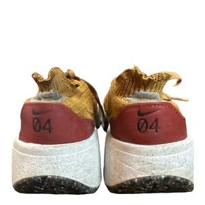 Nike Space Hippie color Wheat Dark Beetroot sneakers. The Nike Space Hippie 04 takes inspiration from the concept of space junk, informing the concept of “trash transformed.” The low-top’s Flyknit upper incorporates filaments from scraps and recycled materials, such as plastic water bottles and T-shirts. The silhouette’s bulbous Crater Foam midsole is supported by Nike Grind rubber under the forefoot and heel.
