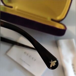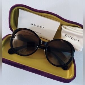 Check out these fire Gucci GG sunglasses! NO SCRATCHES!! They feature the iconic double G's and the bees!! Absolutely stunning sunnies!! Comes with the case and cleaning cloth! Size is 56/19/145. The size and serial numbers are shown in the pictures!