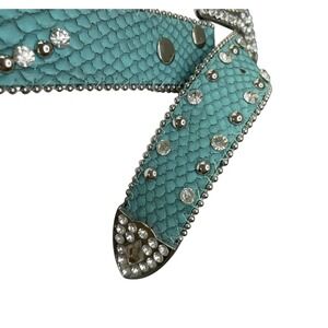 This Western style belt features Teal alligator print leather accented with silver studs and crystal rhinestones.