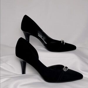 Chic black heels with a sleek silver detail. Perfect for elevating any outfit.
