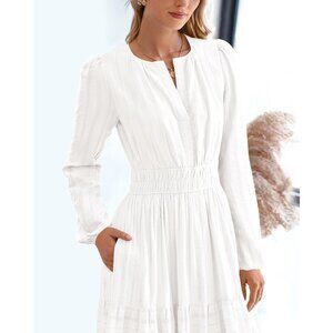Women White Long Sleeve V Neck Elastic Waist Lightweight Maxi Dress Pockets