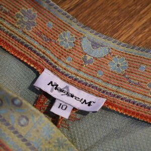 Gorgeous vintage high rise patterned pants. Unique metallic fabric that changes colour depending on the angle/lighting. Straight leg with a side zip closure.