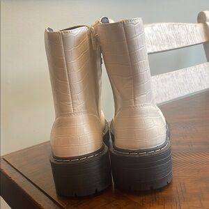 Stylish combat boots with a crocodile texture. Cream color with black laces and soles. Durable and trendy design.