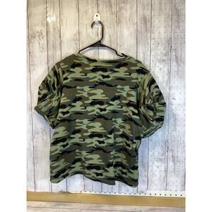 Stylish tee featuring a green and black camouflage print with statement puffy sleeves. Soft, comfortable fabric with a relaxed fit, perfect for casual wear with a modern, fashion-forward twist.