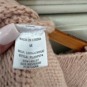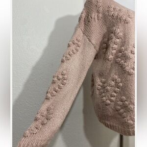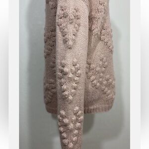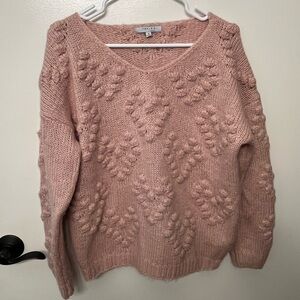 Soft pink chunky knit v neck sweater adorned with adorable textured hearts! PTP is 22”, L is 25”. Loose fit and in like new condition.