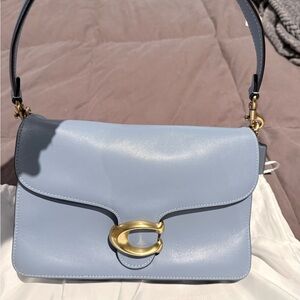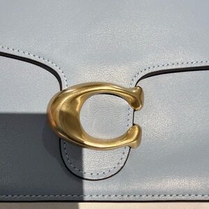 Stylish Coach shoulder bag in sky blue leather. Features striking gold hardware. Ideal for any occasion.