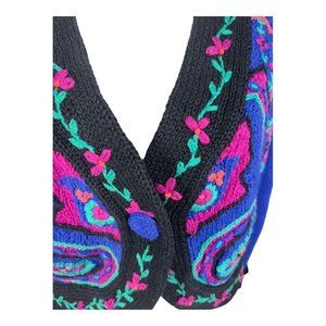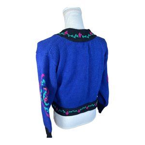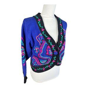 I absolutely adore this hand-knitted sweater. It has a beautiful floral design with a single-button closure. Shorty length. It is in mint condition! I believe this if from the 1990s or perhaps earlier.