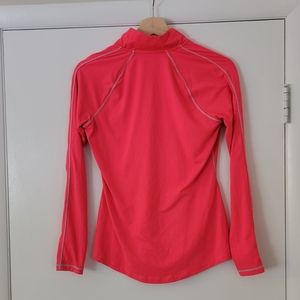 size small, long sleeve active shirt with quarter zip. reflective stitching, hot pink stretch tech fabric. thumb holes. inner care tag cut out, no other flaws noted