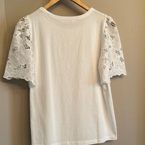 Elegant white top featuring delicate lace sleeves. Perfect for any occasion.