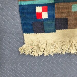 Tapestry is in gently used condition. a faint stain on one size as pictured. Please note that slits are part of traditional weaving and not a flaw. See images for full condition.