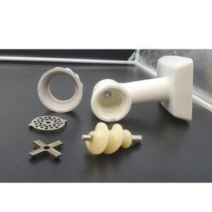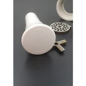 The Oster Regency Kitchen Center Food/Meat Grinder Attachment, Model 954 Vintage is an electric-powered meat grinder designed for use in kitchens. Made of metal and plastic, this white grinder includes a grinding plate, blade, and comes with all the necessary components to function properly. The Oster brand ensures quality and durability, making it a reliable option for grinding meat and other foods efficiently in your kitchen. Our Inv# HWV 040