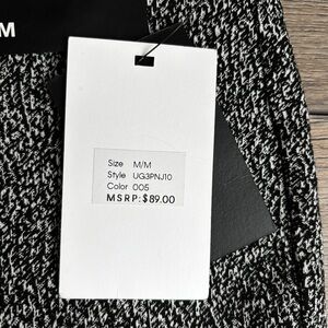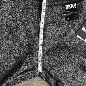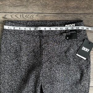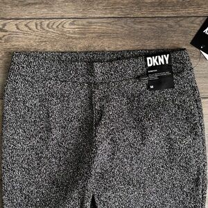 Brand new with tag DKNY dress pants. Versatile black and white colorway. Pull on style, sits just below natural waist. Slim fit through legs and thighs. Slightly tapered leg with ankle length. Material is a rayon/nylon/polyester/spandex blend. See pics for measurements.