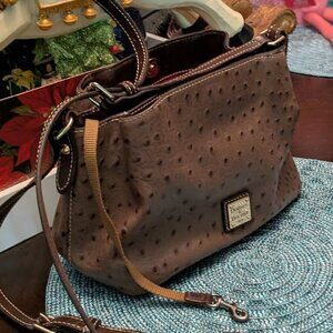 The handbag in the image is a Dooney & Bourke Ostrich Mini Barlow Satchel in brown (sometimes referred to as cognac).