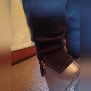 slim fit medium rise distressed stretch black denim jeans. mini zipper at ankles. see pictures. they are part of the description.