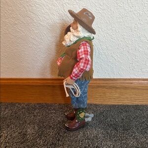 Add a touch of whimsy to your home with this Cowboy Santa figurine. Dressed in a vibrant red and blue outfit, this charming accent piece is perfect for the holiday season. 11 inches tall