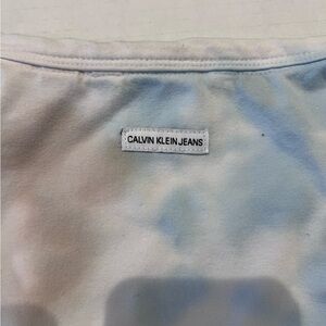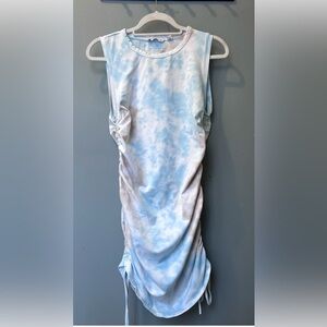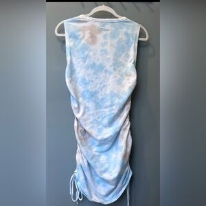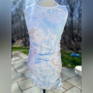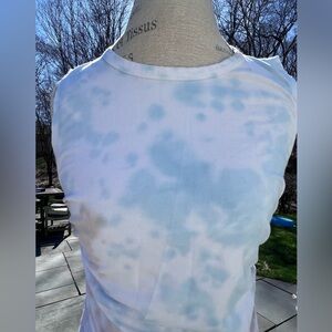 Pre-worn great shape. Color is a tie dye white beige and blue. Very comfy and cool dress. You can wear as a mini dress or a midi.