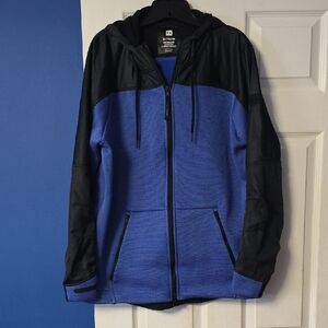 Under Armour hoodie with a zip-up front. Features black accents and blue fabric. Comfortable and stylish design.