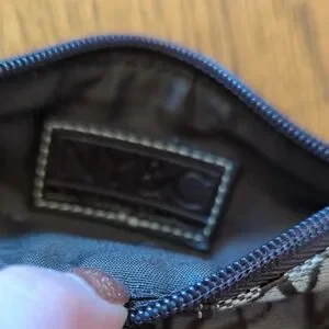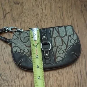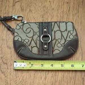 Chic wristlet with monogram design. Features a secure strap and stylish accents.