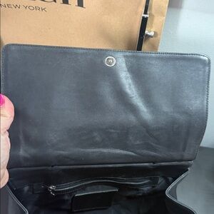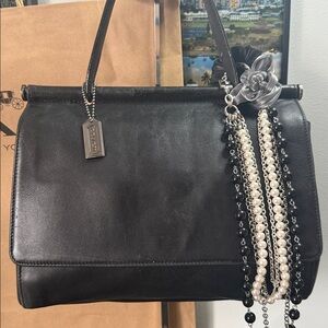 Elegant black leather satchel. Features top handle and Coach tag. Sleek and stylish design.