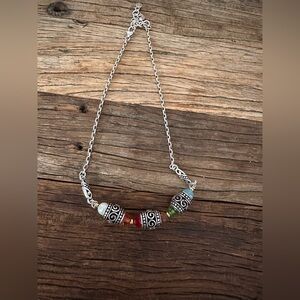 Elegant silver necklace with intricate bead design. Features red, green, and white accents.