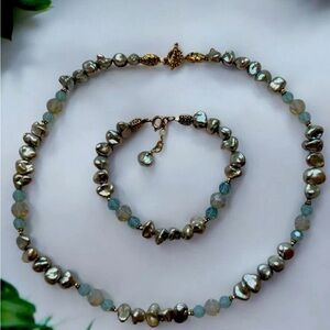 This elegant jewelry set features lustrous Kashi pearls and shimmering beads, and a 120/12k gold clasp, perfect for adding a touch of sophistication to any outfit. The combination of silver and gold tones creates a timeless look.