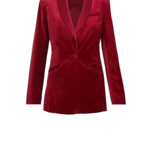 Luxurious red velvet blazer. Ideal for versatile styling. Perfect for any occasion.