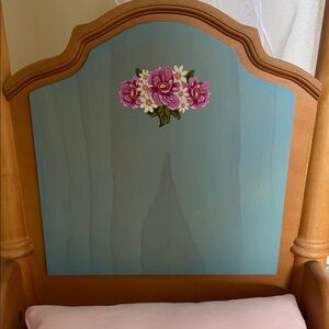 The Half-Canopy Bed (also known as Cécile's Bed and Bedding) was originally introduced to Cécile's Collection in 2011, later Marie-Grace's Collection in 2012, and retired in 2014 with Marie-Grace's and Cécile's archival. Set includes wood bed, mosquito netting, mattress, satin bedspread and pillow. Beautiful wood detail and painted flowers detail. In overall excellent condition. Bed will be dissembled to fit in box and packaged with great care. Price factors in extra shipping charge for weight and size of bed.