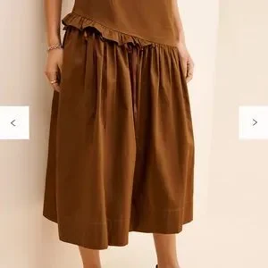 Elevate your wardrobe with this elegant brown midi skirt, featuring a charming ruffle detail. Perfect for any occasion.
