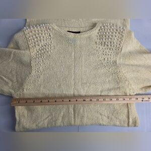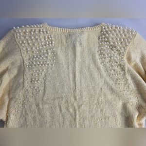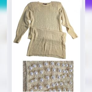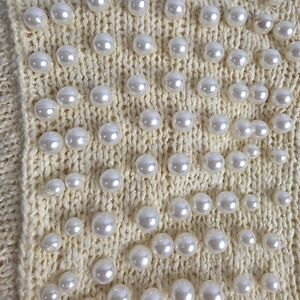 Chic butter-cream knit sweater dress adorned with pearl accents. Perfect blend of style and class.