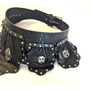 Vintage Esperanza Leather Belt SM Silver Tone Metal Aztec Faces Boho Festival Whimsy Goth, Center section measures 7" in Length by 5 1/2" at widest. Side sections measure 5" in Length.