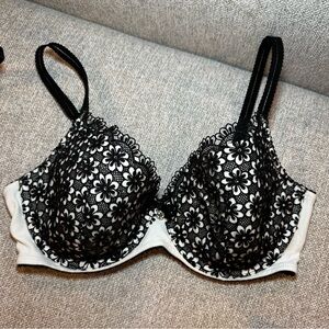 2: Black & White Body by Victoria Lined Demi in 34D. White bra with black flowered overlay and center rhinestone. It is lined.