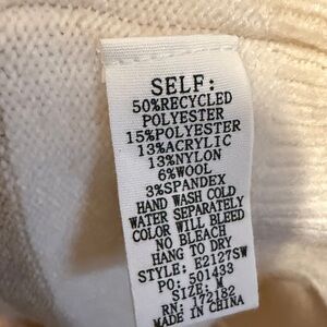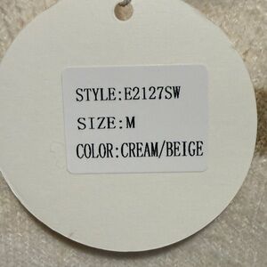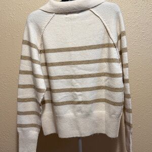 Cozy sweater with beige and cream stripes. Features a V-Neck collar. Soft. This would pair nicely with denim, black, khakis or a suede / leather skirt with boots would be gorgeous.