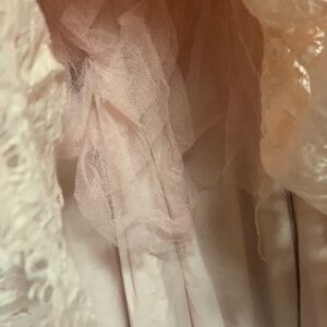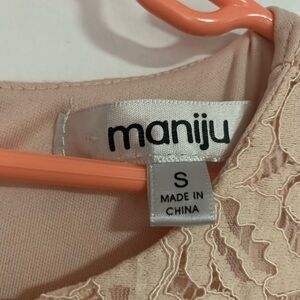 Maniju blush formal maxi gown in size Small. Features a lace top with a sheer net panel at the belly button area, giving a subtle revealing look while still covered. The rest of the dress is fully lined for comfort and coverage. Includes a back zipper closure.