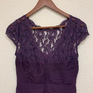 Elegant navy gown with lace bodice. Cap sleeves and ruched skirt. Perfect for formal occasions.