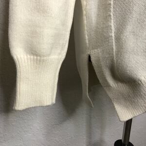 Anthropologie Maeve cream mock turtleneck sweater. Pullover style with mock turtleneck neckline. Ribbed hemline and sleeve cuffs. Curved hemline. Drop shoulder sleeves. Side slit hemline. Size Small. Excellent preowned condition. A couple of tiny spots on sleeve and tiny snag on collar.