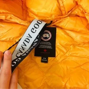 Vibrant orange puffer jacket by Canada Goose. Lightweight and warm. Ideal for chilly days.
