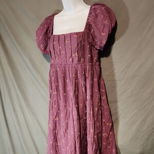 Charming mauve midi dress with floral design. Features puff sleeves and square neckline. Ideal for casual outings.