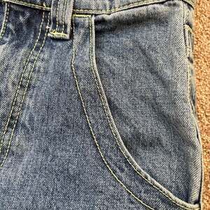 BDG Urban Outfitters Kayla Mid Rise Cargo Jeans, Size 26. These blue denim jeans offer a modern take on cargo style. Featuring unique knee paneling and large utility pockets on the back, they blend functionality with a distinctive aesthetic. The contrasting yellow stitching adds a subtle pop of color and detail. Made in China. Excellent pre-owned condition with no significant flaws. Perfect for a casual, streetwear-inspired look.