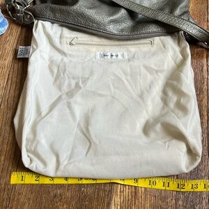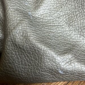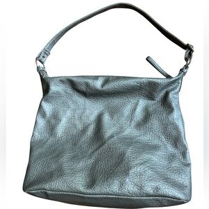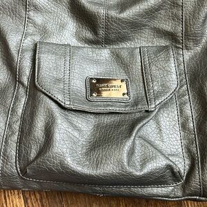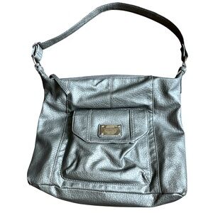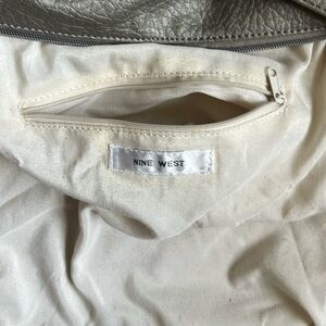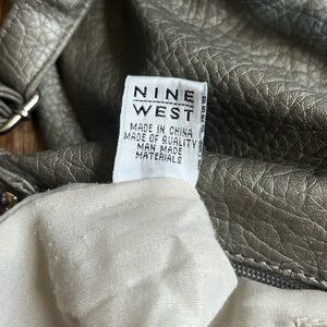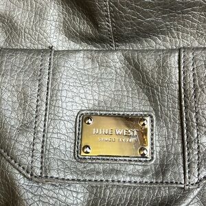 Faux leather shoulder handbag purse from Nine West. Textured material is slightly metallic with a subtle, neutral dark greenish gray color. Large magnet snap pocket on front with riveted silver brand plate. Bag measures about 12” tall x 14” wide. Top zip style with single adjustable strap & silver ring hardware. Solid cream soft fabric lining. Inside, bag has zipper compartment on one side.