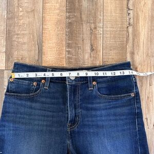 Dark blue jean shorts with a bit of stretch and frayed edges.