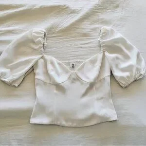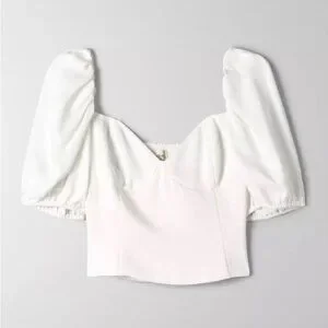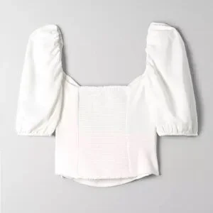 short-sleeve bustier blouse with a sweetheart neckline, puff sleeves and smocked back panel for a more versatile fit. It's cut from ReCrepe™, lightweight, drapey crepe fabric made with LENZING™ ECOVERO™ Viscose