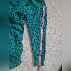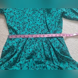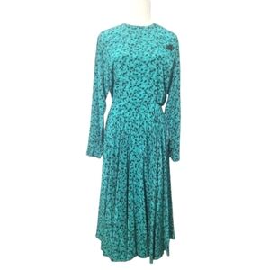This stunning vintage Maggy London by Jeannene Booher dress is made from luxurious 100% silk and showcases an elegant teal and black abstract print. It features a timeless silhouette with long sleeves, a fitted waist, and a flowing midi-length skirt that moves beautifully. The dress was made in Korea and is a Size 8. Perfect for vintage lovers or collectors of classic designer pieces, this dress transitions effortlessly from daywear to evening elegance.