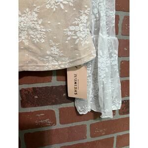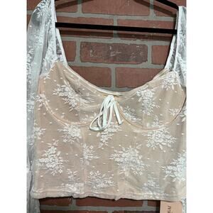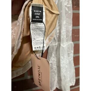 Gorgeous and alluring Shein nude long sleeve lace top in size 2XL. The bodice is lined with a delicate nude fabric, beautifully layered with intricate white lace fabric. The long sleeves are sheer white lace, adding an elegant touch. The bodice features a built-in underwire bra for added support and comfort. This top is perfect for a special occasion or a night out. Add a touch of sophistication to your wardrobe with this stunning piece!