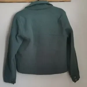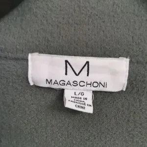 Chic olive utility jacket by Magaschoni. Features gold button accents and front pockets. Ideal for layering.
