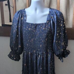 gorgeous dress with navy blue color and gold stars throughout. elastic bodice. Nice flutter puff sleeve. tiered bottom.