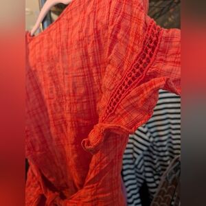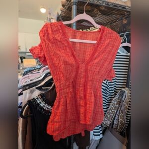 Keywords: coral blouse, plaid top, textured shirt, peplum style, tie waist, v neck, crochet detail, short sleeve, feminine, boho, casual wear, summer fashion, vacation outfit, day to night