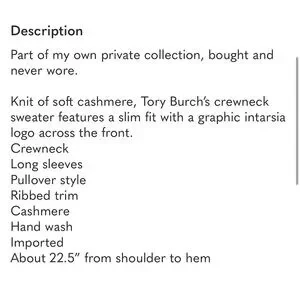 Tory Burch Cashmere sweater with logo! Size Medium. NWOT