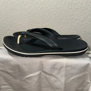 Preowned but still in great condition. Some sign of wear as seen in photos, but true to Crocs, still so much life left for this pair. I’ve personally owned a pair(not this one) for 6 years and it still is the best pair of flip flops I’ve ever owned.