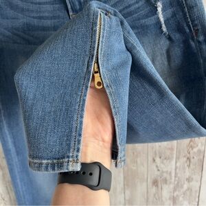 These fit like a boyfriend jean and then narrow down to the ankle with a side zipper detail.