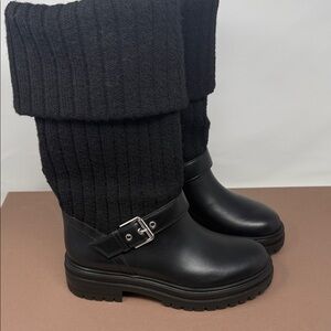 Elegant Leather knit black boots with ribbed cuff. Stylish buckle accent. Ideal for winter wear.